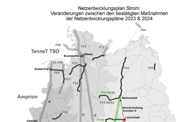 Der NEP beinhaltet noch keine konkreten Trassenverläufe, sondern definiert nur die Anfangs- und Endpunkte von zukünftigen Leitungsverbindungen. Bei einer der großen Gleichstromverbindungen, dem sogenannten "Korridor D" (Maßnahme D18), wurden im NEP 2024 neue Punkte definiert. Statt von Lauchstädt nach Meitingen soll die Leitung nun von Wolmirstedt nach Gundremmingen geführt werden. Die BNetzA vermerkt hier zusätzlich, dass aus netztechnischer Sicht auch der Endpunkt Isar/Landshut denkbar wäre. Die Entscheidung liegt nun beim Bundestag.