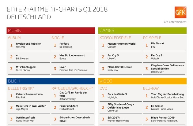 Welche Songs, Bücher, Spiele und Filme haben die Deutschen in den ersten drei Monaten des Jahres am meisten unterhalten? Aufschluss darüber gibt eine Sonderauswertung von GfK Entertainment. Der offizielle Chartermittler hat die Topseller des ersten Quartals 2018 aus vier verschiedenen Entertainment-Bereichen zusammenfasst.