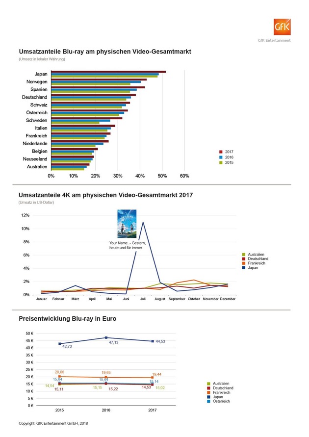 Der Anteil von 4K am physischen Gesamtmarkt lag Ende 2017 bei jeweils rund zwei Prozent - Tendenz steigend. Kleinere Wachstums-Schübe gab es zwischendurch immer wieder. Besonderes Augenmerk galt beispielsweise dem Anime "Your Name. - Gestern, heute und für immer", der in Japan auch als 4K-Ausgabe ein riesiger Erfolg war.