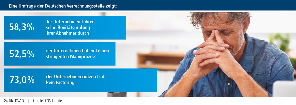 Über zwei Drittel der Befragten (73,0 %) schöpfen das Potenzial, das der Verkauf der Forderungen ("Factoring") ihrem Unternehmen bringt, noch nicht aus. Dabei bietet es gerade kleineren Unternehmen erhebliche Vorteile, wie die sofortige Realisierung erst zukünftig anfallender Rechnungserlöse, die Vermeidung von Zahlungsausfällen und die Professionalisierung der eigenen kaufmännischen Prozesse. Jens Kassow erklärt: "Die Deutsche Verrechnungsstelle bietet diesen Service auch Unternehmern, denen der Zugang zum Factoringmarkt bisher häufig verwehrt war, an. Binnen zwei Bankarbeitstagen nach erfolgtem Ankauf der Forderung erhalten unsere Kunden den Rechnungsbetrag zu 100 Prozent auf ihr Konto ausbezahlt." Ein weiterer positiver Effekt des Factorings ist die mittelfristige Verbesserung des Rating bei Lieferanten, Auskunfteien und Banken, was neue finanzielle Spielräume schafft und hilft, Finanzierungskosten zu senken.
