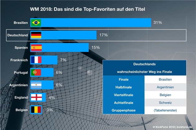 Die komplette Simulation der WM 2018 mit den einzelnen Spielen finden Sie unter https://www.kickform.de/