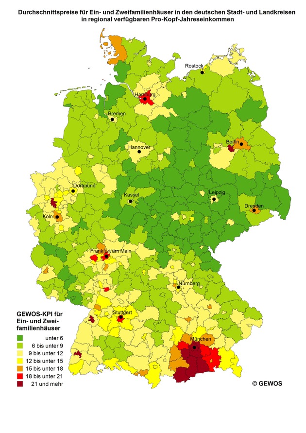 Die Hürden für den Erwerb von Wohneigentum sind regional sehr unterschiedlich hoch. Die Relation von regional verfügbarer Kaufkraft zu dem örtlichen Durchschnittpreis eines Ein- oder Zweifamilienhauses bildet der Kaufkraft-Immobilienpreis-Index - kurz GEWOS-KPI - ab. Anhand des GEWOS-KPI lässt sich für alle deutschen Stadt- und Landkreise ablesen, wie viele Jahreseinkommen für den Erwerb eines Ein- oder Zweifamilienhauses aufgewendet werden müssen.