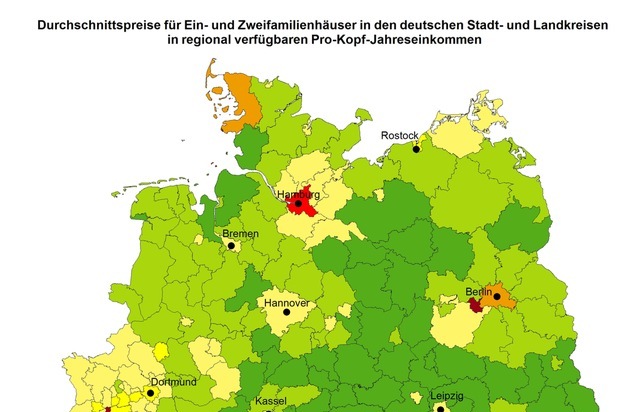 Wie zu erwarten kann die überdurchschnittliche Kaufkraft das wesentlich höhere Preisniveau in den Verdichtungsräumen nicht ausgleichen. In der Stadt München müssen Käufer aktuell mehr als das Dreißigfache der jährlichen Pro-Kopf-Kaufkraft für den Erwerb eines Eigenheims aufwenden. Auch in einigen Landkreisen im Münchner Umland sowie in Düsseldorf, Potsdam, Freiburg und Baden-Baden müssen angesichts eines KPI von mehr als 21 Punkten überdurchschnittlich hohe Kaufpreise gezahlt werden, wenn die regionale Kaufkraft als Maßstab angelegt wird. Neben den Metropolen Berlin, Hamburg, Frankfurt und Köln erreichen zudem vornehmlich südwestdeutsche Städte und Landkreise einen KPI von mehr als 15. Die Ferienregionen im Alpenvorland sowie insbesondere - bedingt durch den Einfluss der Nordfriesischen Inseln - Nordfriesland weisen gemessen an der Kaufkraft vor Ort eine vergleichsweise geringe Erschwinglichkeit in Bezug auf den Eigenheimerwerb auf. Im Vergleich zum Süden und zu großen Teilen Westdeutschlands erweisen sich Nord- und insbesondere Ostdeutschland weiterhin als deutlich erschwinglicher. In weiten Teilen Ostdeutschlands müssen Käufer für ein Ein- oder Zweifamilienhaus weniger als das Sechsfache des durchschnittlichen Jahreseinkommens aufwenden. Neben Berlin und Potsdam erreichen im Osten Deutschlands lediglich Dresden, Rostock und Jena Indexwerte von 12 und mehr.