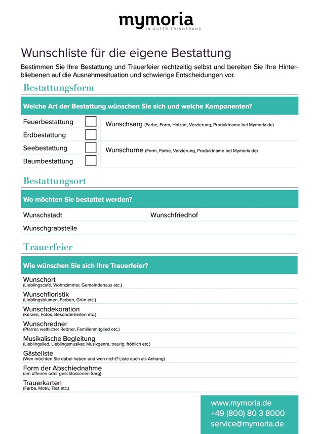 Um das unbequeme Thema Bestattung zugänglicher zu machen, hat Mymoria, der erste Online-Anbieter für komplette Bestattungen und Vorsorge, eine Wunschliste für die eigene Beisetzung entwickelt. Auf einer Seite sind alle wichtigen Punkte zu Ort, Art und Ablauf aufgeführt. Manchen hilft es, die Liste im Kreis der Familie auszufüllen, andere machen das lieber allein. Wer sich rechtzeitig mit dem Thema auseinandersetzt, kann Ort, Art und Ablauf selbst bestimmen und entlastet damit die Angehörigen.