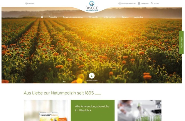 Schon auf der Startseite ist die Liebe zu Mensch und Natur deutlich spürbar. Hier eröffnet sich dem Besucher durch eingebettete Filmsequenzen der Blick auf die heimischen Heilpflanzenfelder und nimmt ihn mit auf eine emotionale Reise in die Welt der Naturmedizin. Eine bessere Bedienbarkeit und eine schnellere Orientierung im breiten Produktangebot von PASCOE Naturmedizin waren die Vorgaben an die Entwickler. Die Bereiche "Produkte" und "Anwendungsgebiete" erhielten daher einen verbesserten Aufbau und eine vereinfachte Suchfunktion. Im Bereich "Wirkstoffe" wird jede Arzneipflanze einzeln abgebildet und erklärt.