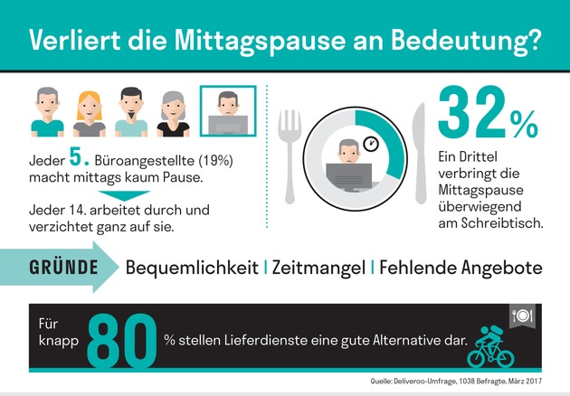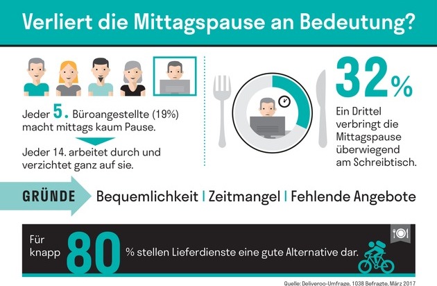 - Für knapp 80% stellen Lieferdienste eine gute Alternative darImmer mehr Büroangestellte haben keinen Zugang zu einer firmeneigenen Kantine. Wie wirkt sich das fehlende Angebot für Mitarbeiter auf die Mittagspause und Essensgewohnheiten am Arbeitsplatz aus? Anlässlich des Weltgesundheitstages am 7. April hat der Essenslieferdienst Deliveroo eine repräsentative Befragung* unter 1.038 deutschen Büroangestellten durchgeführt, die keinen Zugang zu einer firmeneigenen Kantine haben.