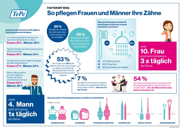allem bei ihnen Zuspruch (20 %)Generell zeigt die Fünfte Deutsche Mundgesundheitsstudie, die vom Institut der Deutschen Zahnärzte herausgegeben wird, dass Zahnzwischenraumpflege heute besser im Alltag verankert als in der Vergangenheit.*** Das verdeutlicht auch die TePe Studie: 39 % der Frauen und 29 % der Männer geben an, ein- bis zweimal täglich die Zahnzwischenräume zu reinigen. Die ärztliche Empfehlung dazu: "Da eine Zahnbürste allein nur ca. 50 %**** der Zahnoberfläche reinigt, sollte ein Mal am Tag die Plaque in den Zahnzwischenräumen gründlich entfernt werden, denn sie bildet sich binnen 24 Stunden nach der Reinigung neu", erklärt Dr. Ralf Seltmann, Zahnarzt bei TePe.