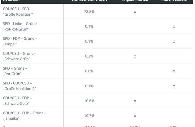 Falls die SPD sich einer Großen Koalition verweigern sollte, ist die Wahrscheinlichkeit groß, dass sie sich in der Opposition wiederfindet. Voraussichtlich regiert dann eine Jamaika-Koalition: Mit einer Wahrscheinlichkeit von rund 60 Prozent kommt eine Koalition von CDU/CSU, FDP und Grünen zustande, gefolgt von Schwarz-Grün mit einer Wahrscheinlichkeit von etwa 21 Prozent und Schwarz-Gelb mit rund 15 Prozent. Die SPD selbst hätte außerhalb der Großen Koalition nur eine sehr geringe Chance auf eine Regierungsbeteiligung: Für Rot-Rot-Grün oder eine Ampel-Koalition stehen die Chancen bei unter 1 Prozent. In rund 4 Prozent der Fälle käme gar keine Mehrheitsregierung zustande - dann wäre nur eine Minderheitsregierung möglich oder es gäbe Neuwahlen. Damit sinkt die Wahrscheinlichkeit, dass Angela Merkel im Rahmen einer Mehrheitsregierung Bundeskanzlerin bleibt, leicht auf rund 96 Prozent.