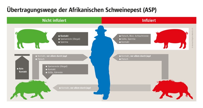 Die Angst vor der Schweinepest hat vor allem wirtschaftliche Ursachen. Der Deutsche Bauernverband geht von zwei bis drei Milliarden Euro Umsatzeinbußen bei einem Ausbruch der Krankheit in Deutschland aus. [4] Zugleich aber ist die jetzige Situation ein willkommener Anlass für die Landwirte, öffentlichkeitswirksam gegen das angebliche "Wildschweinproblem" zu mobilisieren, das sie durch den verstärkten Maisanbau der letzten Jahre selbst geschaffen haben. "Und jetzt graben sich die Bauern selbst wieder die nächste Grube", resümiert Sandra Franz. "Denn gegen die ASP hilft kurzfristig nur ein sofortiger Stopp der Jagd sowie der Einfuhr tierischer Produkte, wie der Blick auf die Übertragungswege zeigt. Und langfristig hat die Tierindustrie ohnehin keine Zukunft, aus ethischen wie auch aus ökologischen Gründen." Stattdessen fordert Animal Rights Watch von Politik und Landwirtschaft, die Förderung pflanzlicher Alternativen und den Ausstieg aus der Fleischproduktion mit aller Kraft voranzutreiben.