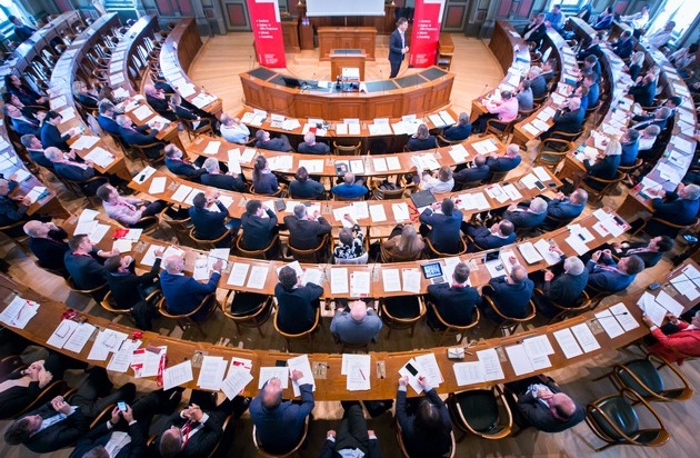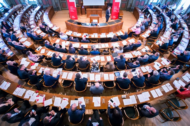 Die Bestuhlung in Form einer Arena ist ausgerichtet auf die Tribüne des Präsidiums. Wo sonst die Parlamentarierinnen und Parlamentarier agieren, referieren einmal im Jahr handverlesene Dozenten und Spezialisten aus Industrie und Wirtschaft. Das Ambiente ist themenkonform. An der Decke stellen Frauengestalten die Eckpfeiler eines gut funktionierenden Staatswesens dar: Rechtsordnung, Fortschritt, Bildung und Kultur, was sich gut auf Unternehmungen übertragen lässt. Ebenso die Flügelwesen, welche an die Kultur der politischen Debatte erinnern sollen: Ruhe, Ausgleich, Maß und Milde.