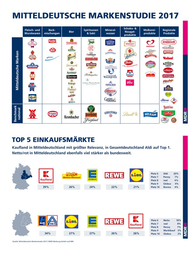 Für die Verbraucher in Mitteldeutschland geht Region vor Bio. Auch bei der Wahl der bevorzugten Einkaufsmärkte unterscheiden sich die Sachsen, Sachsen-Anhalter und Thüringer von den Käufern in Gesamtdeutschland. Die bekanntesten Marken aus Mitteldeutschland, denen der Sprung zur nationalen Marke gelungen ist, sind Rotkäppchen, Bautz'ner Senf und Radeberger Bier. Das sind einige zentrale Ergebnisse der MITTELDEUTSCHEN MARKENSTUDIE 2017, die im Auftrag der MDR-Werbung GmbH (MDRW) erstellt und heute in Leipzig präsentiert wurden. Das IMK Institut für angewandte Marketing- und Kommunikationsforschung hat im Frühsommer jeweils rund 1.500 Verbraucherinnen und Verbraucher in Mitteldeutschland sowie 1.500 in den übrigen 13 Bundesländern repräsentativ befragt. Insgesamt wurden rund 60 mitteldeutsche Marken in unterschiedlichen Produktsegmenten mit jeweils einer renommierten nationalen Marke verglichen. Nach sieben Jahren Erforschung der Unterschiede zwischen Ost und West setzt die neue MDRW Studie den Fokus auf die Markenbekanntheit in Mitteldeutschland.