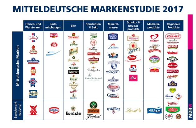 Rotkäppchen-Sekt ist und bleibt die bekannteste Marke aus Mitteldeutschland. Spontan nennen 74 Prozent in Mitteldeutschland und 45 Prozent in Gesamtdeutschland den Sekt aus Freyburg an der Unstrut, das ist Platz 1 in beiden Gebieten. Bei der Verwendung in den vergangenen vier Wochen erzielt Rotkäppchen mit 50 Prozent in Mitteldeutschland und 32 Prozent in Gesamtdeutschland ebenfalls hohe Zustimmungswerte. Auch Radeberger Bier und Bautz'ner Senf finden sowohl in Mitteldeutschland als auch in Gesamtdeutschland den Weg in die Einkaufskörbe.