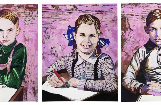 Voller Optimismus schauen die drei Schüler aus der Serie UNSERE BESTEN auf ihrer Schulbank sitzend den Betrachter an. Eine Mischung aus Stolz und Selbstbewusstsein, aber auch manierlichen Verhaltens, wie es elterlich erwartet wird, scheint ihre Haltung zu prägen. Kleidung und Mode spiegeln eine Zeit, die wir mit der Kindheit heutiger Großeltern assoziieren - eine Zeit, in der individuelle Freiheit als Konzept der Persönlichkeitsentwicklung noch nicht vorgesehen war. Man könnte die Protagonisten vor ihrem stets undefiniert abstrakten, geheimnisvoll bleibenden Hintergrund mit dem Satz beschreiben: "Sie haben brav ihre Haltung eingenommen." Welche Gedanken und Wünsche, Pläne und Vorstellungen von der Welt und ihrem eigenen Leben sich in ihren Köpfen befinden kann man nicht sehen, nur bestenfalls erahnen.