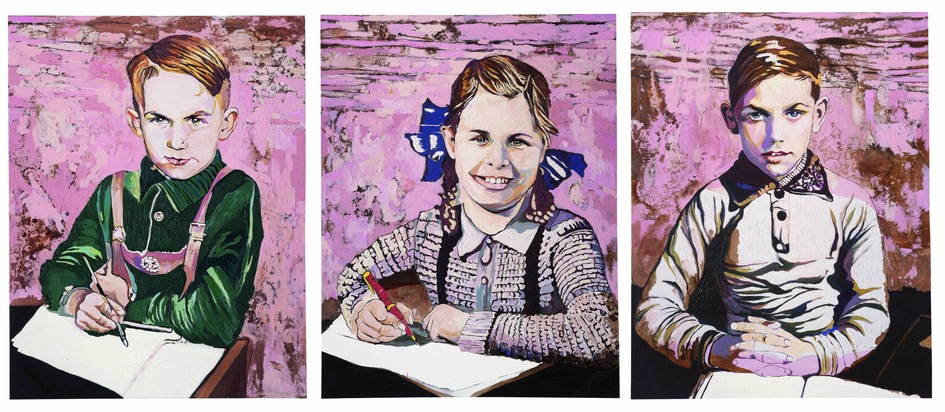 Voller Optimismus schauen die drei Schüler aus der Serie UNSERE BESTEN auf ihrer Schulbank sitzend den Betrachter an. Eine Mischung aus Stolz und Selbstbewusstsein, aber auch manierlichen Verhaltens, wie es elterlich erwartet wird, scheint ihre Haltung zu prägen. Kleidung und Mode spiegeln eine Zeit, die wir mit der Kindheit heutiger Großeltern assoziieren - eine Zeit, in der individuelle Freiheit als Konzept der Persönlichkeitsentwicklung noch nicht vorgesehen war. Man könnte die Protagonisten vor ihrem stets undefiniert abstrakten, geheimnisvoll bleibenden Hintergrund mit dem Satz beschreiben: "Sie haben brav ihre Haltung eingenommen." Welche Gedanken und Wünsche, Pläne und Vorstellungen von der Welt und ihrem eigenen Leben sich in ihren Köpfen befinden kann man nicht sehen, nur bestenfalls erahnen.
