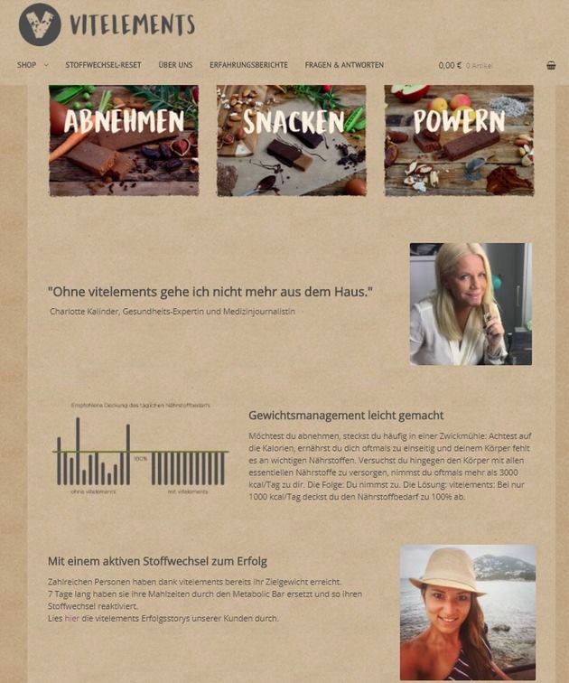 - Neuer Online-Shop unter vitelements.com - Bewährte Riegel und Drinks zum Abnehmen - Vollwertige Ernährung auf Basis natürlicher Zutaten - Ausführliche Erfahrungsberichte von Kunden