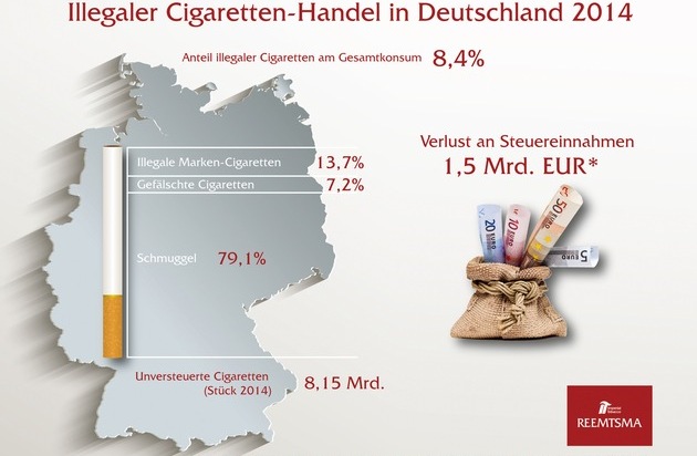Über ein Viertel und damit die meisten der in Deutschland gerauchten illegalen Cigaretten kamen 2014 mit 2,10 Milliarden Stück aus Polen, gut ein Fünftel (1,64 Milliarden Stück) stammten aus der Tschechischen Republik, danach folgten Cigaretten aus Weißrussland, Russland und der Ukraine. Der Konsum aller gefälschten und geschmuggelten Cigaretten führte in Deutschland im vergangenen Jahr zu einem geschätzten Steuerausfall von rund 1,5 Milliarden Euro.