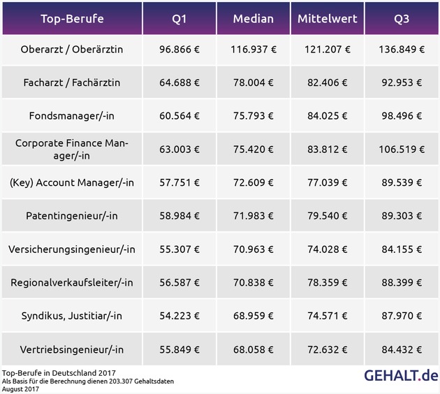 Oberärzte erhalten mit 116.937 Euro das höchste Gehalt in Deutschland. Fachärzte folgen mit rund 78.000 Euro und Fondsmanager belegen den dritten Platz mit 75.800 Euro im Jahr. Absolventen der Rechts- und Wirtschaftswissenschaften dominieren die untere Hälfte der Top 10-Berufe. Für Pateningenieure und Rechtsanwälte liegt die Gehaltsspannweite zwischen 72.000 bis 74.000 Euro. Alle genannten Berufe erfordern einen akademischen Hintergrund. "Wer in Deutschland ein hohes Gehalt beziehen möchte, kommt um ein Studium kaum herum", sagt Philip Bierbach, Geschäftsführer von Gehalt.de.