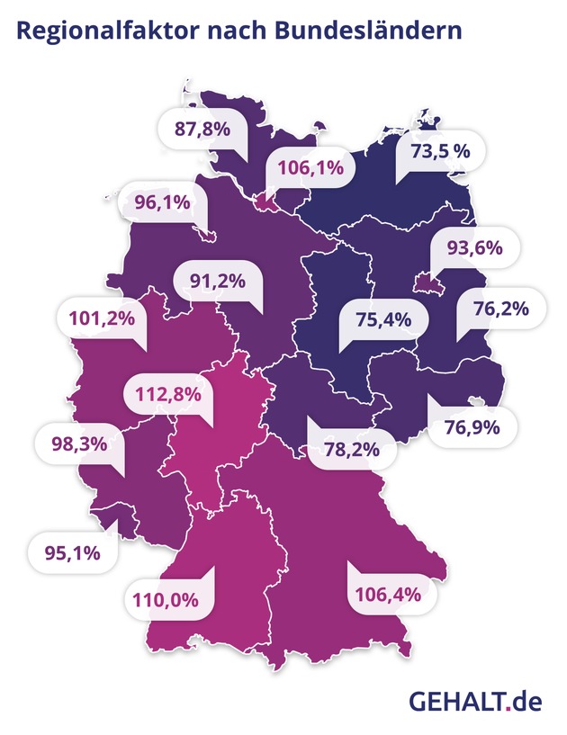 Das Bundesland Hessen dominiert in diesem Jahr das Länderranking. Mit einem Lohnniveau von 112,7 Prozent liegt Hessen vor Baden-Württemberg (110 Prozent) und Bayern (106,4 Prozent). Auf den hinteren Plätzen im Bundeslandranking befinden sich Mecklenburg-Vorpommern (73,5 Prozent), Sachsen-Anhalt (75,4 Prozent) und Brandenburg (76,2 Prozent). "Ein wichtiger Grund für die verhältnismäßig geringen Gehälter in den neuen Bundesländern ist, dass dort vor allem kleine bis mittelgroße Unternehmen ihren Sitz haben. DAX-Unternehmen und andere kapitalstarke Firmen sind größtenteils in den alten Bundesländern vertreten", erklärt Philip Bierbach, Geschäftsführer von Gehalt.de.