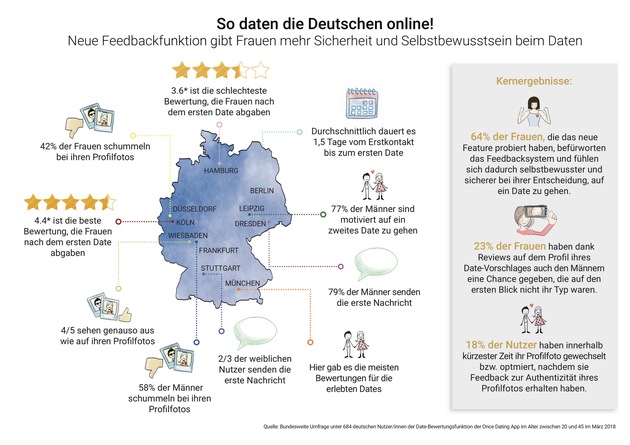 Once revolutioniert mit "Rate Your Date" das Online-Dating: Nach wenigen Wochen schon 10.000 Bewertungen allein in Deutschland. 64% der weiblichen Once-User fühlen sich durch die Bewertungsfunktion wohler. Katalysator für das Berliner Liebesleben: Nur 1,5 Tage bis zum ersten Date. In Köln bewerten Frauen ihr erstes Date mit 4,4 von 5 Sternen besonders positiv. Frankfurter und Düsseldorferinnen tricksen überdurchschnittlich bei ihrem Profilfoto.