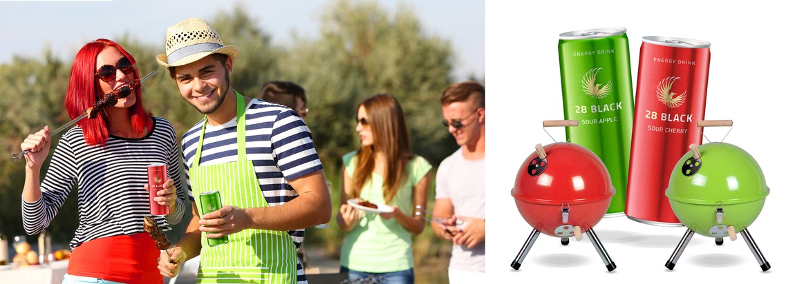 Und dabei geht es um mehr als nur um die Wurst. Das Brutzeln auf dem heißen Rost wird immer anspruchsvoller und hat sich zum angesagten Lifestyle-Thema mit Kultstatus entwickelt. Kein Wunder also, dass die altbekannten Klassiker wie Steak und Würstchen nach Abwechslung verlangen. Fisch, Meeresfrüchte, Gemüse, Pizza und sogar Eintöpfe haben sich zwischenzeitlich ihren Platz auf dem Grill erobert. Selbst ganze Menüs bis hin zum Dessert und von schnell bis raffiniert werden auf dem Grill zubereitet und lassen auch die Herzen von Gourmets höher schlagen. Bleibt noch die Frage nach dem passenden Getränk. Und da gilt - ganz gleich, ob zuhause im Garten oder auf dem Balkon, entspannt im Park oder gemütlich am Strand - mit einem erfrischenden Getränk schmecken die Köstlichkeiten vom Grill gleich doppelt so gut! Wie zum Beispiel mit den beiden neuen Sorten Sour Apple und Sour Cherry des Energy Drinks 28 BLACK. Das sauer-prickelnde Duo mit Energie-Kick ist das ultimative Getränk für jede Grillparty, das auch ausgemachte Biertrinker überzeugt. Die praktischen 250ml-Slimline-Dosen in Apfelgrün und Kirschrot sind außerdem schnell zu kühlen, bruchsicher und passen in jede Kühltasche. Wie alle Sorten des Energy Drinks 28 BLACK zeichnen sich auch die beiden Sour Varianten Apple und Cherry durch die typischen 28 BLACK Eigenschaften aus: vegan, glutenfrei, laktosefrei, keine künstlichen Farb- und Konservierungsstoffe und vor allem kein Taurin.