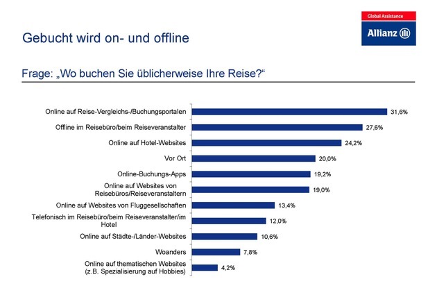 Trotz einer Vielzahl an Online-Angeboten vertraut fast ein Drittel der Deutschen weiterhin auf Reiseexperten vor Ort - das ergab eine Umfrage der Allianz Global Assistance. 27,6 Prozent der Befragten gaben an, ihren Urlaub üblicherweise offline im traditionellen Reisebüro oder beim Reiseveranstalter zu buchen. Beliebter sind nur Online-Reise-Vergleichs- und Buchungsportale wie CHECK24 Reise oder lastminute.de: Mit 31,6 Prozent bevorzugen die meisten Befragten diese Art der Buchung.