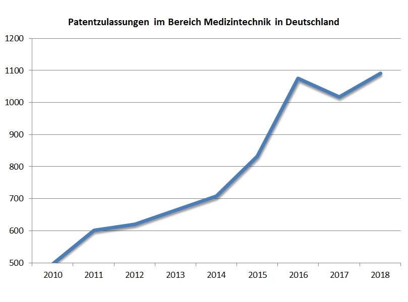 Entwicklung Patentzulassungen im Bereich Medizintechnik (Grafik): https://iwk-cp.com/patentzulassungen-im-bereich-medizintechnik/, Quelle: SHS-Medizintechnik-Index 2019 / Europäisches Patentamt