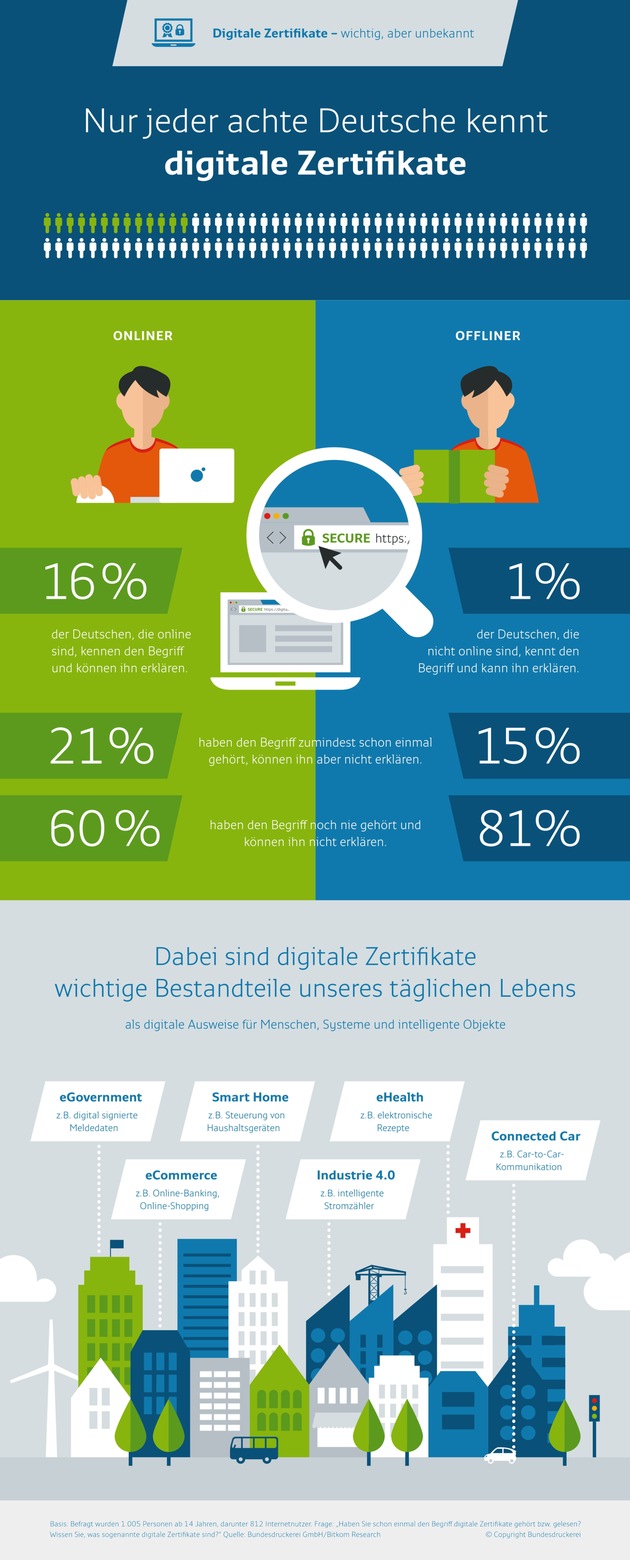 Hinweis zur Methodik: Grundlage der Angaben ist eine Umfrage, die Bitkom Research im Februar 2016 im Auftrag der Bundesdruckerei GmbH durchgeführt hat. Dabei wurden 1.005 Verbraucher ab 14 Jahren befragt, darunter 812 Internetnutzer. Die Umfrage ist repräsentativ. Die Frage lautete: "Haben Sie schon einmal den Begriff ,digitale Zertifikate' gehört bzw. gelesen? Wissen Sie, was sogenannte ,digitale Zertifikate' sind?"