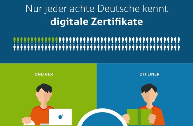 Laut Umfrage haben fast zwei Drittel (64 Prozent) aller Bundesbürger, also Onliner wie Offliner, den Begriff digitale Zertifikate noch nie gehört. Nur jeder achte (13 Prozent) kann ihn erklären. Dabei basieren fast alle modernen Verfahren für sichere Authentifizierung, Verschlüsselung und elektronische Signatur auf ihnen. Mit ihnen kann jede Person oder jedes Gerät in der digitalen Welt seine wahre Identität nachweisen. Zertifikate schützen die kryptografischen Schlüssel von Personen oder Organisationen vor Fälschung und Manipulation.