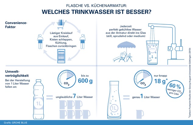 Parkplatzsuche, einkaufen, Kisten schleppen, Platz im Kühlschrank schaffen, leere Flaschen zurückbringen - wer seinen Tagesbedarf an Flüssigkeit mit Trinkwasser aus der Flasche deckt, weiß um die beschriebenen Umstände. Und wenn jeder in der Familie einen anderen Typ Wasser mag, müssen gleich drei verschiedene Sorten gekauft werden. Was für eine schweißtreibende Schlepperei! Anders sieht es beim "Unbottled Water" aus der Küchenarmatur aus. Ein bei Verbrauchern beliebtes Wassersystem ist beispielsweise GROHE Blue. Es besteht aus einer Küchenarmatur sowie einem Kühler mit integriertem Filter und CO2-Flasche. Auf Knopfdruck liefert es leckeres, gefiltertes und auf die optimale Trinktemperatur gekühltes Wasser in den Varianten still, medium und sprudelnd direkt ins Glas. Damit gehört das lästige Kistenschleppen der Vergangenheit an und jeder in der Familie kann sein Wasser so genießen wie gewünscht - alles aus einer Quelle. Fazit des Vergleichs: In puncto Convenience-Faktor hat die hauseigene Quelle deutlich die Nase vorn.