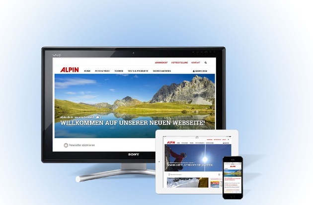 www.alpin.de wird jetzt auch dann optimal dargestellt, wenn von unterwegs auf das Angebot zugegriffen wird. Dank des innovativen Responsive Designs passt sich die Website automatisch jedem Format an - egal ob Desktop-PC, Tablet, oder Smartphone.