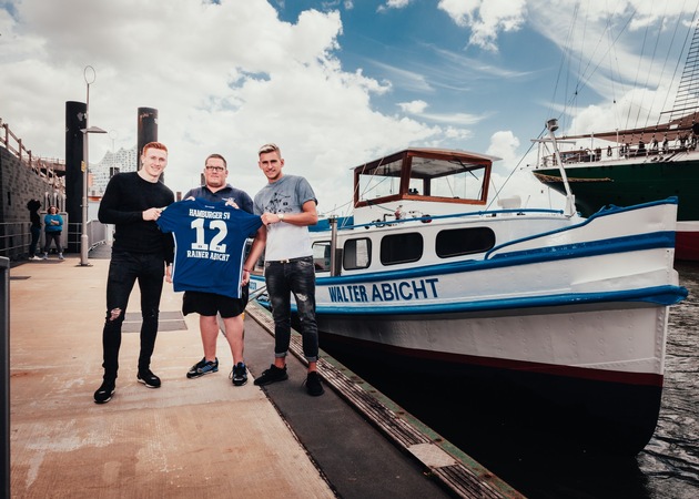 Die beiden HSV-Profis Julian Pollersbeck und David Bates läuteten die Partnerschaft bereits durch eine Trikotübergabe im Hafen an einen Kapitän von Rainer Abicht ein.