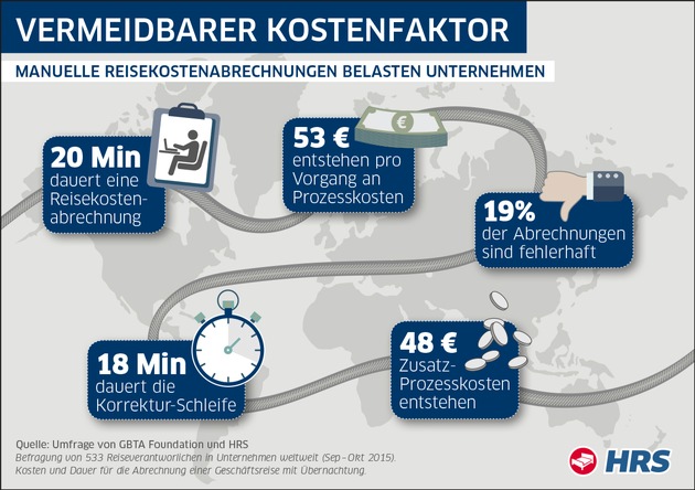 Studie von HRS und GBTA Foundation deckt vermeidbare Kosten auf +++ Pro Reisekostenabrechnung fallen durchschnittlich 20 Minuten Arbeitszeit an +++ Je Abrechnung entstehen Prozesskosten von durchschnittlich 53 Euro +++ Einsparungen von bis zu 50 Prozent durch digitale Lösungen möglich
