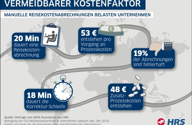 Studie von HRS und GBTA Foundation deckt vermeidbare Kosten auf +++ Pro Reisekostenabrechnung fallen durchschnittlich 20 Minuten Arbeitszeit an +++ Je Abrechnung entstehen Prozesskosten von durchschnittlich 53 Euro +++ Einsparungen von bis zu 50 Prozent durch digitale Lösungen möglich