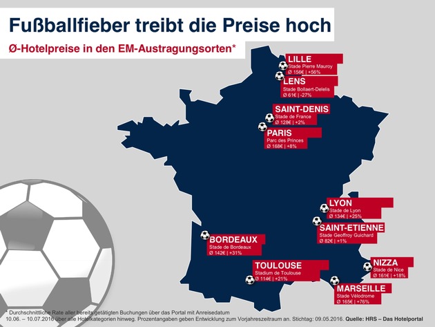Zur Europameisterschaft im Juni steigen die Hotelpreise in den französischen Austragungsorten deutlich an - im Mittel auf 131 Euro und damit 21 Prozent über dem Vorjahreszeitraum. Dies hat das Hotelportal HRS in einer aktuellen Analyse ermittelt. Häufig sind die Hotelpreise am Vortag der jeweiligen Spiele höher als am Spieltag selbst. Doch noch gibt es einige preiswerte Hotelangebote. Tipp: Wer bei der Hotelsuche auf HRS.de oder der mobilen App den Namen des Stadions angibt anstelle der Stadt (z.B. "Stade de France" statt "Saint-Denis"), bekommt direkt eine Auswahl der nächstgelegenen Hotels.