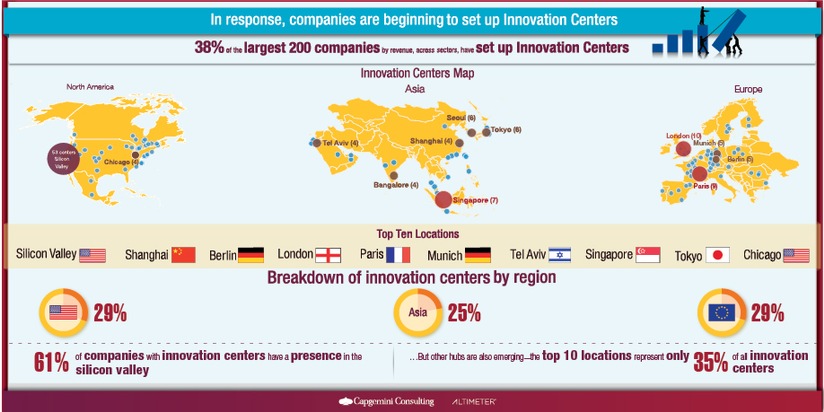 Digitale Innovationen werden immer wichtiger, jedoch tun sich führende Unternehmen damit weiterhin schwer. 38 Prozent der 200 führenden Unternehmen haben weltweit physische Innovationszenten in Technik-Ballungsräumen gegründet, um traditionelle Wege herkömmlicher Forschungs- & Entwicklungs-Ansätze zu verlassen. Das zeigt die Studie "The Innovation Game: Why and How Businesses are Investing in Innovation Centers" der Altimeter-Gruppe und Capgemini Consulting. Die Studie beschreibt, dass große traditionelle Unternehmen zu schlecht gerüstet sind, um sich der Herausforderung des sogenannten digitalen Darwinismus zu stellen. Mit den Innovationszentren soll ein Ökosystem an Start-ups, Risikokapital-Anlegern, Inkubatoren und akademischen Institutionen gefördert werden. Mit jeweils fünf Innovationslaboren zählen Berlin und München zu den Top-zehn-Städten, die weltweit die meisten Labore aufweisen. Für die Studie wurden Innovationszentren der 200 größten Unternehmen aus den Sektoren Automotive, Finanzdienstleistungen, Konsumgüter & Handel, Produktion und Telekommunikation untersucht. Zusätzliche Erkenntnisse ergaben sich aus qualitativen Befragungen von Innovations-Verantwortlichen der Unternehmen.