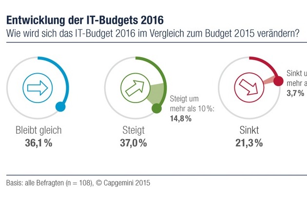 Im kommenden Jahr steigen die IT-Budgets bei 37,0 Prozent der Unternehmen, bei knapp 15 Prozent sogar im zweistelligen Bereich. Damit sind die Prognosen optimistischer als für das laufende Jahr, in dem einem Drittel der IT-Verantwortlichen mehr IT-Budget zur Verfügung stand. Der Anteil der CIOs, der 2016 von Kürzungen betroffen ist, steigt mit 21,3 Prozent nur leicht (2015 19,4 Prozent). Für 2017 rechnen mit 38,1 Prozent ähnlich viele CIOs mit höheren Investitionen wie im kommenden Jahr, während die Prognosen für 2018 verhaltener ausfallen. Die Angaben wurden im Rahmen der jährlichen IT-Trends-Studie im September und Oktober dieses Jahres von Capgemini erhoben. Insgesamt nahmen 153 IT-Verantwortliche von Großunternehmen in Deutschland, Österreich und der Schweiz teil, darunter 11 Firmen aus dem DAX-30. Die Gesamt-Auswertung der IT-Trends-Studie wird Anfang Februar 2016 veröffentlicht.