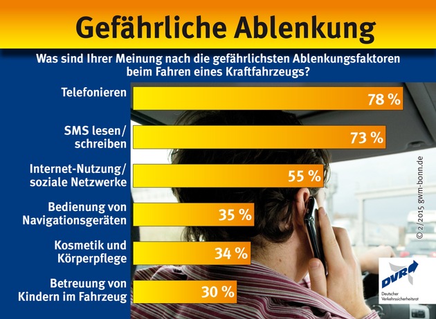 Drei Viertel der Autofahrerinnen und Autofahrer sind der Meinung, dass Telefonieren (78 Prozent) und das Lesen oder Schreiben von SMS (73 Prozent) die gefährlichsten Ablenkungsfaktoren beim Fahren eines Kraftfahrzeugs darstellen. Dies ergab eine repräsentative Befragung, die im Auftrag des Deutschen Verkehrssicherheitsrates (DVR) im November 2015 vom Marktforschungsinstitut Ipsos bei 2.000 Personen über 14 Jahren durchgeführt wurde. An dritter Stelle bei der Einschätzung der Gefährlichkeit rangierten Internetnutzung und soziale Dienste (55 Prozent), gefolgt von der Bedienung von Navigationsgeräten (35 Prozent). Der DVR weist darauf hin, dass nach Schätzung von Experten jeder zehnte Verkehrsunfall durch Ablenkung verursacht wird. Wenn der Blick auf das Display des Smartphones nur zwei Sekunden dauere, lege man bei einer Landstraßenfahrt und einem Tempo von 100 km/h bereits 56 Meter im Blindflug zurück. Der DVR appelliert an alle Verkehrsteilnehmer, Ablenkung beim Fahren möglichst zu meiden.