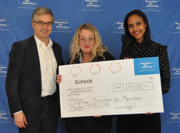 Eine Spende über 10.000 Euro erhielt am Dienstag (21.2.) die Stiftung Menschen für Menschen von der Schmuckdesignerin Julia Neumann vom Schmucklabel Chaingang (München). Die Spende nahm das Top-Model und Menschen für Menschen-Botschafterin Sara Nuru zusammen mit dem Vorstand der Stiftung, Dr. Sebastian Brandis, entgegen. "Wir sagen im Namen der Menschen in Äthiopien ein herzliches Dankeschön. Mit dem Geld können wir in unseren ländlichen Entwicklungsprojekten wieder vielen Kindern, Frauen und Männern ein kleines Stück mehr Hoffnung auf ein besseres Leben geben", sagte dazu Sebastian Brandis.