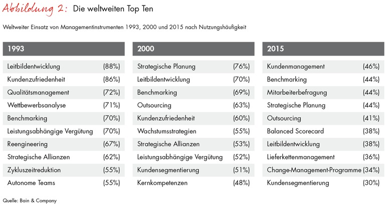 Die Beliebtheit und der Einsatz einzelner Managementmethoden verändern sich im Zeitverlauf. Während die Nutzung von Kundenmanagement und Benchmarking in Europa konstant bleibt, wird Qualitätsmanagement heute weit weniger angewendet als noch vor 20 Jahren. Insgesamt unterliegen viele Managementwerkzeuge einem Lebenszyklus, der an den von Konsumartikeln erinnert.