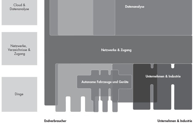 Neue Produkte und Dienstleistungen entstehen, wenn viele Geräte über ein Netzwerk verbunden werden, etwa bei der medizinischen Überwachung von Patienten in Krankenhäusern, der Qualitätskontrolle in Fabriken oder der Messung von Kundenzufriedenheit im Handel. Unternehmen werden ihre langjährigen Geschäftsbeziehungen zu Telekommunikationsausrüstern und Serviceanbietern überprüfen, um selbst von den neuen Möglichkeiten des Internets der Dinge zu profitieren. Die Telekommunikationskonzerne wiederum werden versuchen, ihre Kunden zu halten - durch neue Geräte und Apps, die eine bessere Verbindung, Verifizierung und Ortung der Kommunikationsteilnehmer ermöglichen. "Hier wird sich ein intensiver Wettbewerb zwischen alten und neuen Anbietern entwickeln", prognostiziert Schorling.
