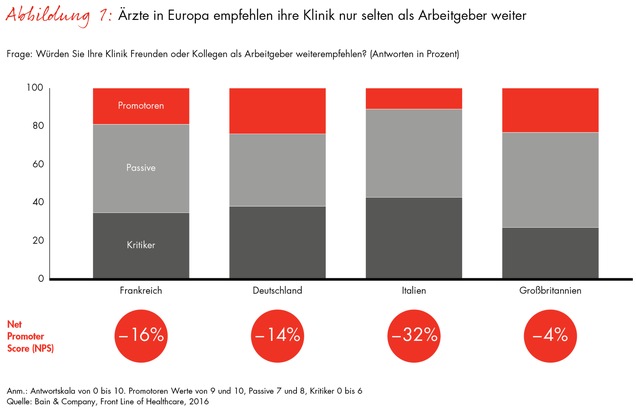 In Deutschland ist der Anteil der Mediziner, die ihre Klinik weiterempfehlen würden, am größten. Hier würde fast jeder zweite Arzt (42 Prozent) zu einer Behandlung in seinem Krankenhaus raten. In Frankreich und Italien dagegen wäre nicht einmal jeder Fünfte dazu bereit. Ähnlich sieht es in puncto Weiterempfehlung der eigenen Klinik als Arbeitgeber aus. In Deutschland und Großbritannien würde dies etwa jeder vierte Arzt tun. In Italien ist nicht einmal jeder zehnte Mediziner von seinem Krankenhaus so überzeugt, dass er es als Arbeitsplatz anraten würde.