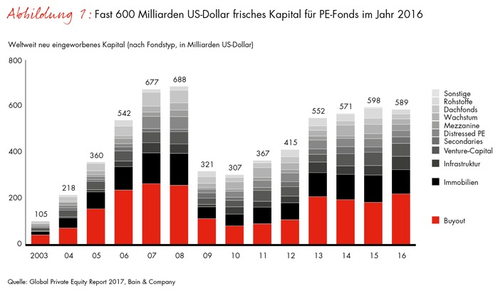 richtig aufstellenAngesichts volatiler Kapitalmärkte und niedriger Zinsen setzen institutionelle Anleger weltweit auf die Ertragschancen von Private Equity (PE). Und das mit Recht, denn auch 2016 war ein gutes Jahr für Finanzinvestoren. So konnten PE-Fonds weltweit frisches Kapital in Höhe von insgesamt 589 Milliarden US-Dollar einwerben (Abb. 1). Danach verfügte die Branche Ende 2016 über rund 1,5 Billionen US-Dollar nicht investiertes Kapital - so viel wie noch nie. Ein Drittel davon steht für Leveraged-Buyout-(LBO-)Transaktionen bereit. Die Gesamtsumme entspricht in etwa dem jährlichen Bruttoinlandsprodukt des G7-Mitglieds Kanada und würde die PE-Branche zu einer der zwölf größten Volkswirtschaften der Welt machen.