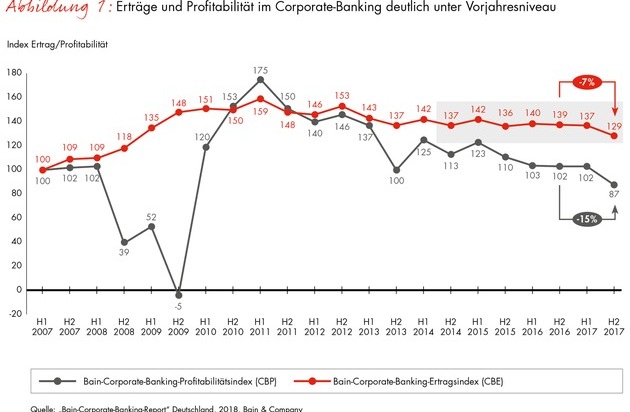 Der halbjährlich erhobene Bain-Corporate-Banking-Index basiert auf veröffentlichten Daten führender deutscher Banken. Das Panel deckt rund die Hälfte der Bilanzsumme der 100 größten in Deutschland tätigen Banken ab und konzentriert sich auf Finanzinstitute mit einem Schwerpunkt im Corporate-Banking und einer entsprechenden Segmentberichterstattung. Bei der erstmaligen Erstellung erfasste Bain für die Jahre 2007 bis 2012 zahlreiche Rohdaten jeder einzelnen Bank, darunter die Erträge (Zins- und Provisionsüberschuss), die Kostenstruktur (Verwaltungsaufwand), die Kreditrisikovorsorge, die Profitabilität (Ergebnis vor Steuern), das Eigenkapital und das Kreditvolumen. Die Wahl des Ausgangsjahrs 2007 ermöglicht Vergleiche zwischen dem letzten Jahr vor Ausbruch der globalen Finanzkrise und der aktuellen Situation.