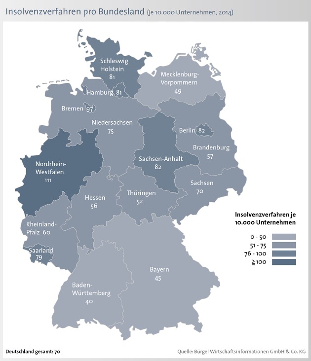 In fünf Bundesländern steigen die Fallzahlen entgegen dem Bundestrend an. Den deutlichsten Zuwachs verzeichnet Bremen mit 17,4 Prozent mehr Insolvenzen. In Thüringen und Hamburg (je 2 Prozent mehr Insolvenzen), Berlin (1,5 Prozent) und Schleswig-Holstein (0,9 Prozent)steigen die Insolvenzzahlen nur gering an. Der deutlichste Rückgang im Jahr 2014 wurde in Sachsen-Anhalt registriert. Hier gab es 16,3 Prozent weniger Firmeninsolvenzen als noch vor einem Jahr. Aber auch Rheinland-Pfalz (minus 13,4 Prozent), Sachsen (minus 13 Prozent), Nordrhein-Westfalen (minus 12,9 Prozent), Hessen (minus 9,5 Prozent) und Baden-Württemberg (minus 9,3 Prozent) verzeichnen hohe Rückgänge.