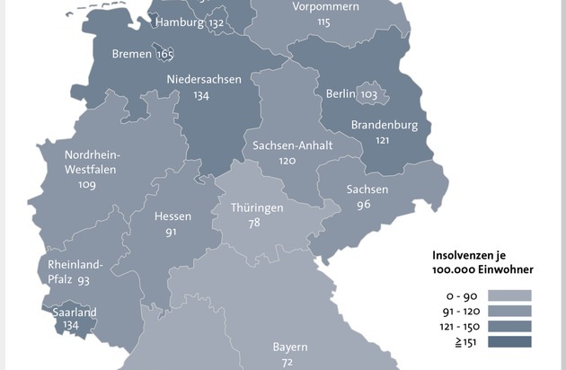 In den ersten neun Monaten des Jahres setzt sich ein Trend der vergangenen Jahre fort. Bei den Privatinsolvenzen in Deutschland zeigt sich ein ausgeprägtes Nord-Süd-Gefälle. Am meisten Privatinsolvenzen gab es demnach mit 165 Insolvenzen je 100.000 Einwohner in Bremen. Es folgen Niedersachsen und das Saarland mit 134 Privatinsolvenzen je 100.000 Einwohner. Auch Hamburg (132) und Schleswig-Holstein (130) liegen deutlich über dem Bundesdurchschnitt von 99 Privatinsolvenzen je 100.000 Einwohner. Positiver ist die Situation im Süden Deutschlands, der weniger von Privatinsolvenzen betroffen ist. Hier schneiden Baden-Württemberg und Bayern (je 74) und mit etwas Abstand Thüringen (78) am besten ab.