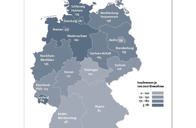 Das Bundesland Bremen nimmt bei der Auswertung der Privatinsolvenzen eine besondere Rolle ein. Im Ranking der absoluten Zahlen steht Bremen mit 1.406 privaten Insolvenzen am besten da. Diese Reihenfolge ändert sich jedoch, wenn die relativen Zahlen - Privatinsolvenzen je 100.000 Einwohner - in die Analyse einbezogen werden. Mit 212 Privatinsolvenzen je 100.000 Einwohner steht Bremen demnach an der Spitze der Statistik. Am zweithäufigsten wurden im Jahr 2015 im Saarland Privatinsolvenzen gemeldet. Hier kommen auf 100.000 Einwohner 184 Privatinsolvenzen. Es folgen mit Hamburg (181), Niedersachsen (180) und Schleswig-Holstein (174) ausnahmslos norddeutsche Bundesländer. Damit setzte sich das sogenannte Nord-Süd-Gefälle bei den Privatinsolvenzen - mit Ausnahme des Saarlandes - auch im Jahr 2015 fort. Weniger Privatpleiten gab es in den südlichen Bundesländern. In Bayern meldeten nur 85 von 100.000 Bürgern eine Insolvenz an. Ebenfalls niedrige Werte lieferten Baden-Württemberg (96) und Thüringen (102). Der Bundesdurchschnitt lag im Jahr 2015 bei 133 Privatinsolvenzen je 100.000 Einwohner.