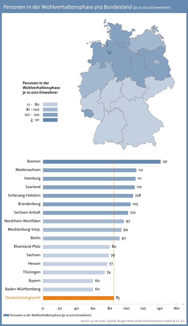 In Bremen (141 Privatpersonen je 10.000 Einwohner), Niedersachsen (112) und Hamburg (111) befinden sich relativ gesehen die meisten Personen in der Wohlverhaltensphase. Der Bundesdurchschnitt liegt bei 85 Privatpersonen je 10.000 Einwohner bzw. bei 0,85 Prozent. Weit weniger Privatpersonen leben in Bayern und Baden-Württemberg (60 Privatpersonen je 10.000 Einwohner) in der Wohlverhaltensphase. Absolut gesehen stehen die Bundesländer Nordrhein-Westfalen (171.690), Niedersachsen (87.600) und Bayern (76.377) an der Spitze der Statistik.
