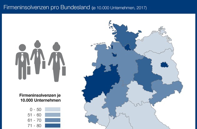 Ein Blick auf die Bundesländer zeigt, dass die Firmeninsolvenzen regional unterschiedlich stark ausgeprägt sind. Nach den absoluten Insolvenzzahlen stehen Nordrhein-Westfalen (5.871 Firmeninsolvenzen), Bayern (2.589) und Baden-Württemberg (1.956) an der Spitze der Statistik. Die Insolvenzdichte (Firmeninsolvenzen je 10.000 Unternehmen) liefert ein anderes Ergebnis. Demnach gab es im bundesweiten Vergleich mit 92 Insolvenzen je 10.000 Unternehmen in Berlin die meisten Pleiten im Jahr 2017. Der Bundesdurchschnitt lag 2017 bei 62 Insolvenzen je 10.000 Unternehmen. Die wenigsten Firmenpleiten gab es im Jahr 2017 mit 43 Firmenpleiten je 10.000 Unternehmen in Bayern.