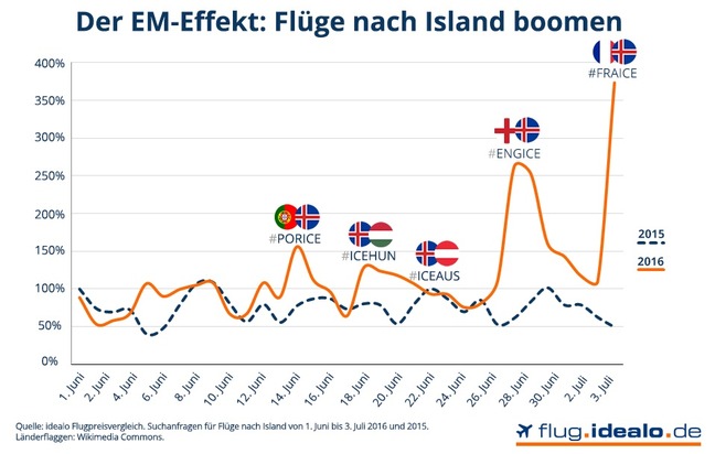 Der absolute Spitzenwert wurde vergangenen Sonntag erreicht: Am Tag des Viertelfinales gegen Frankreich fielen die Suchanfragen für Flüge nach Island um 239 Prozent höher als am Vortag aus - trotz der 5:2-Niederlage für die Isländer. Verglichen mit 2015 war das Interesse an diesem Tag sogar um 656 Prozent höher.