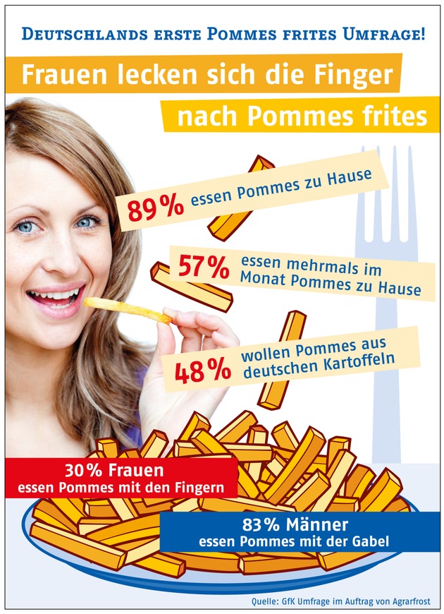 *Im Auftrag von Agrarfrost - dem Spezialist für tiefgekühlte Kartoffelprodukte - hat die GfK, Gesellschaft für Konsumforschung, bevölkerungsrepräsentativ 1.005 Personen ab 14 Jahren im gesamten Bundesgebiet über ihre Einstellung zu Pommes frites befragt.